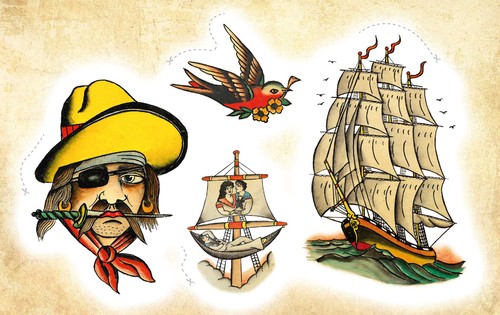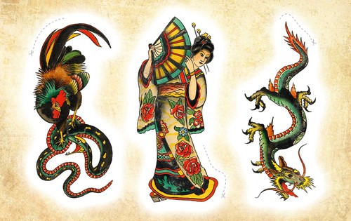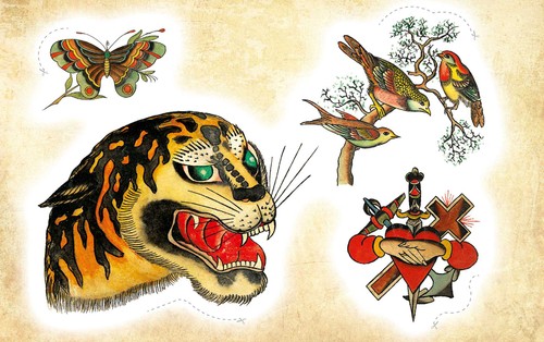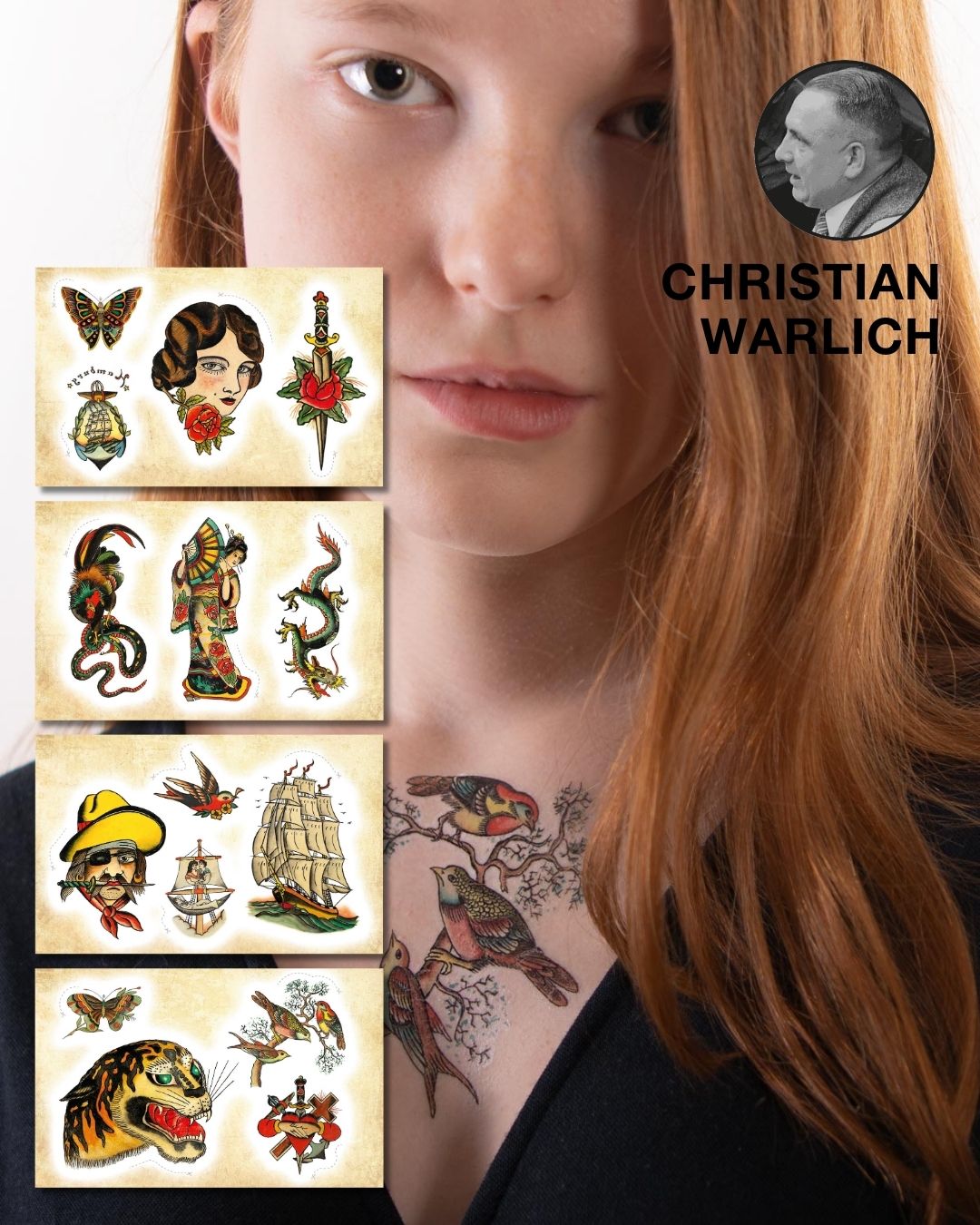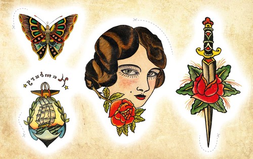 Dieses Set bringt traditionelle Tattoo-Flash-Motive im historischen Oldschool-Stil auf die Haut. Von Schwalben, Tigern und Drachen über Dolche, Schiffe und Portraits bis hin zu bunten Vintage-Symbolen. Alle Designs sind kräftig, klar und im typischen Flash-Look gehalten. Anwendung: Ausschneiden, Folie abziehen, Tattoo platzieren, anfeuchten, 20 Sekunden andrücken, vorsichtig abziehen.
