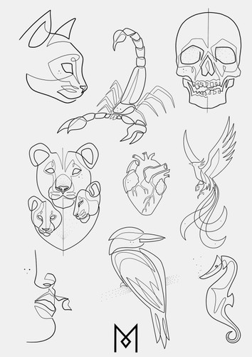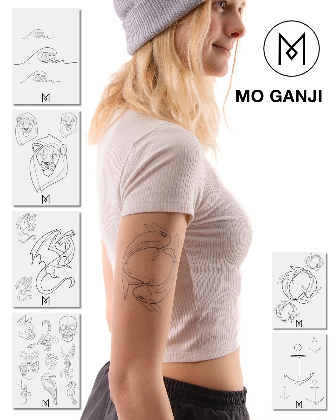 Dieses Set vereint klare, minimalistische One-Line Designs im typischen Mo-Ganj-Style. Von Wellen, Löwenköpfen und Ankern über abstrakte Tiere bis hin zu Drachen und feinen Symbolen, jedes Motiv entsteht aus einer einzigen durchgehenden Linie und wirkt dadurch besonders modern und clean. Anwendung: Ausschneiden, Folie abziehen, Tattoo platzieren, anfeuchten, 20 Sekunden andrücken, vorsichtig abziehen.