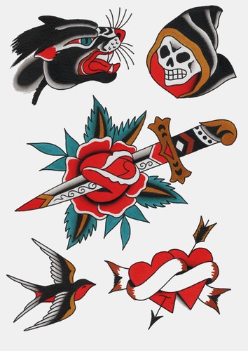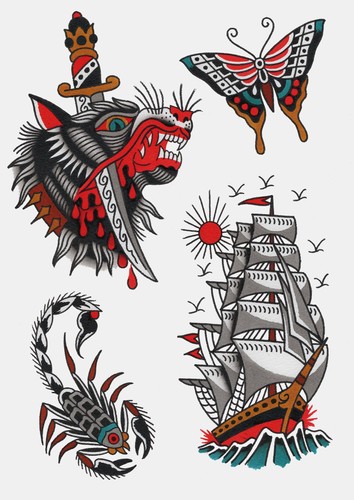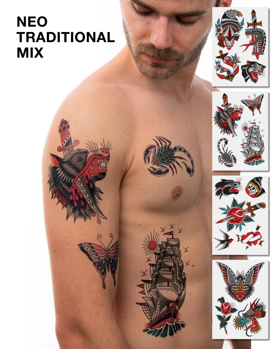 Dieses Bundle vereint mehrere starke Motive im Neo- und Western-Traditional-Stil. Klare Outlines, kräftige Farben und ikonische Tattoo-Klassiker machen diese Designs besonders ausdrucksstark. Perfekt für alle, die bold lines, zeitlose Motive und den charakteristischen Look traditioneller Tattoos lieben. Anwendung: Motiv ausschneiden, Folie abziehen, Tattoo auf die Haut legen, gut anfeuchten, kurz andrücken und vorsichtig abziehen.